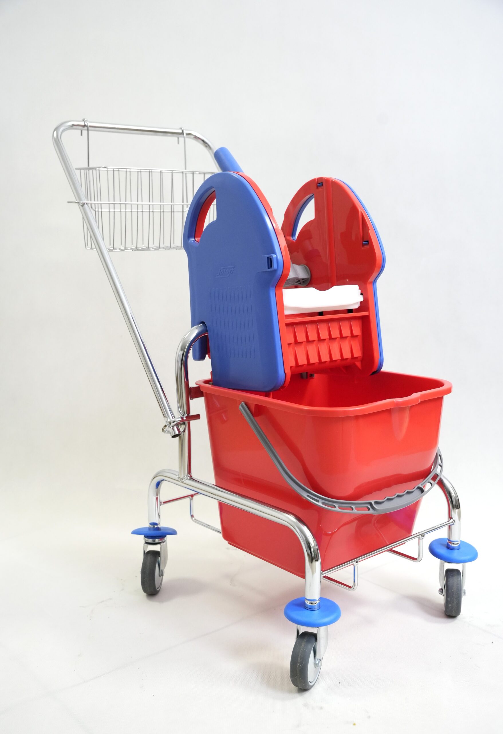 Dodatkowym udogodnieniem jest metalowy koszyk, idealny do przechowywania środków czystości lub akcesoriów do sprzątania. Wózek osadzony jest na czterech kółkach samoskrętnych, które zapewniają ciche, płynne i łatwe manewrowanie nawet w wąskich przestrzeniach.